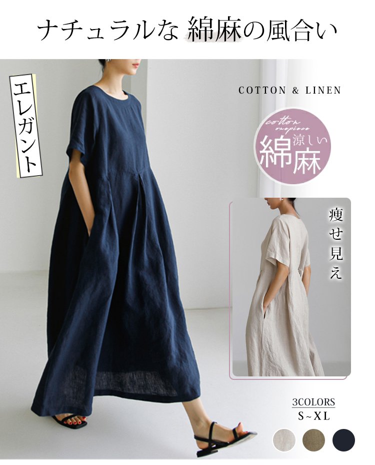 【2025 春新作】 綿麻生地、痩せ見え、贅肉カバー、通気吸湿、エコ捺染